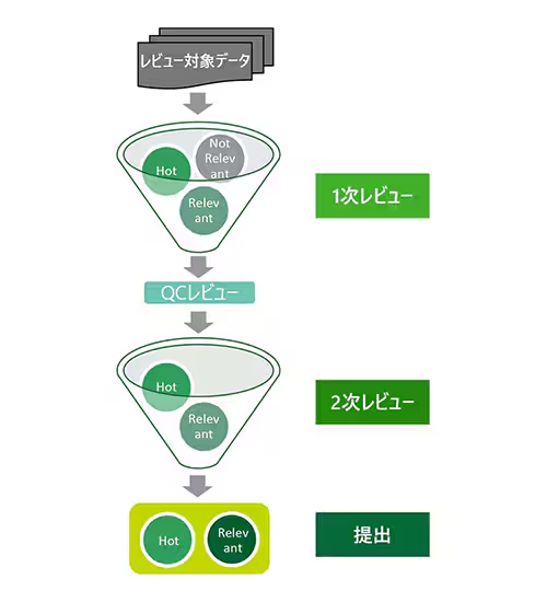 その後、実際に人の目でデータを確認する「レビュー」作業を行うことになるが、一般的なレビューの進め方は以下の通りである。まず、1次レビューにおいて、データの性質により大まかに分類を行う。1次レビューを行う目的は、キーワード検索等のシステムでふるい落とすことができない無関係なデーを取り除き、2次レビューで精査するためのデータを見つけだすことである。「Hot」(重要/事実を明確に裏付ける)、「Relevant」(関連性あり)、「Not Relevant」(関連性なし)等の仕分けを行うのが通常である。1次レビューを行ったデータは、QC(Quality Control)レビューにて内容を確認した後に、事案の内容を理解している会計士や弁護士等による2次レビューが実施される。2次レビューにて「Hot」もしくは「Relevant」と判断されたデータについて、調査委員会やクライアント企業等へ提出される。