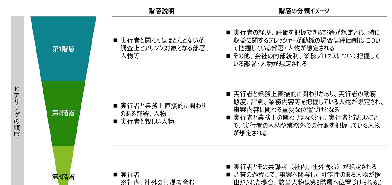 第2階層:第3階層へのヒアリングに向けて実施されるもので、実行者が所属する部・課の役職員、実行者と直接的に関わりのある人物(実行者が所属する部・課を除く)や、実行者と親しい人物などが想定される。ここでは、実行者の業務内容や勤務態度、担当業務の流れ、手口詳細、不正への関与者等を主眼においたヒアリングを実施する。この他、不正の内容や背景によってマネジメント層へのヒアリングを実施することもあれば、デジタルフォレンジックやアンケート調査等で検出された事項に応じて追加でヒアリング対象者の選定を行う。