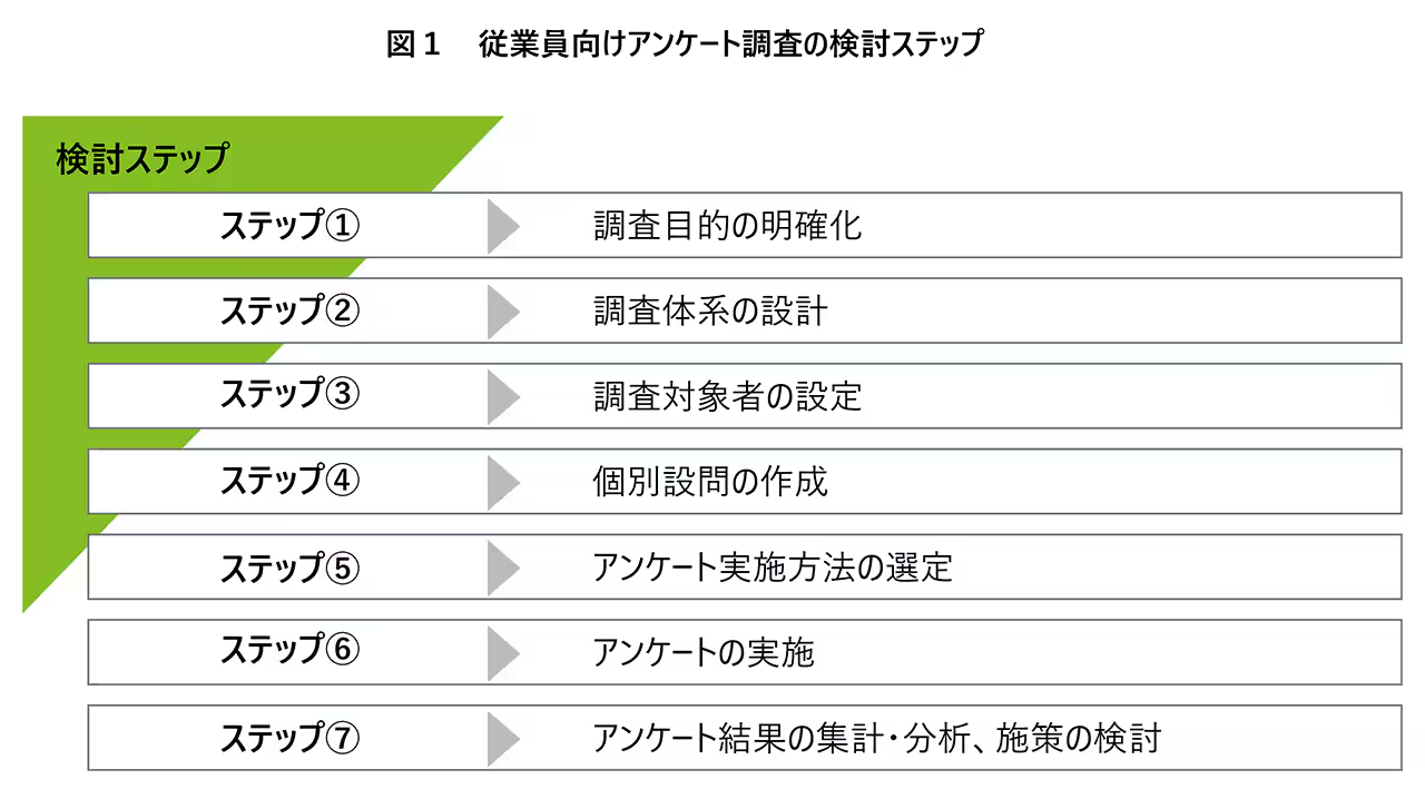 従業員向けアンケート調査実施に向けた基本的な検討ステップは、以下のとおりである。