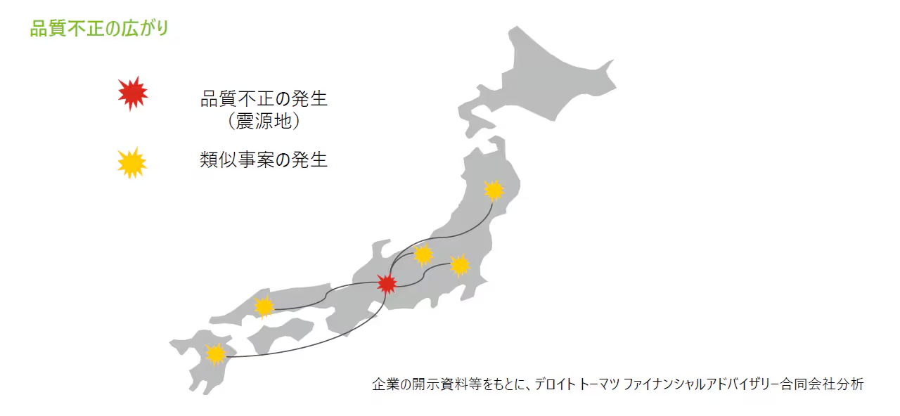 最後に、一度品質不正が発覚すると別の類似事案が発覚することが多いことも際立った特徴として挙げられる。顧客・取引先からの指摘への対応や、規制当局その他のステークホルダーへの説明責任を果たすため、類似事案の有無を調査することが多いが、ほとんどのケースでなんらかの追加事案が発覚する。これは、組織風土の問題が真因として控えており、それが企業グループ全体に広く波及していることを示している。