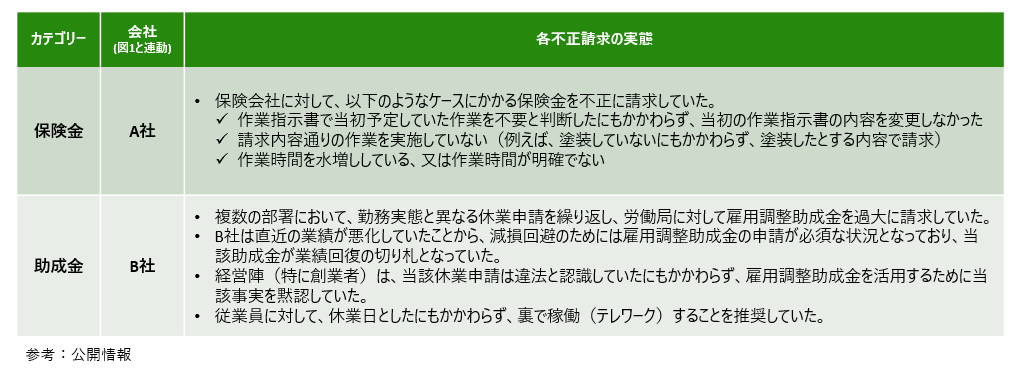 図2の2社の不正請求は、特定の個人というよりも組織上の問題が原因となって生じた不正といえる。いずれも組織ぐるみで、実態とは異なる情報等に基づき不正な請求を行っていた事例である。