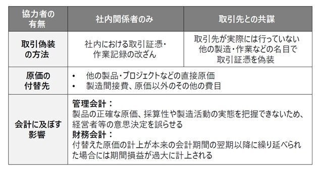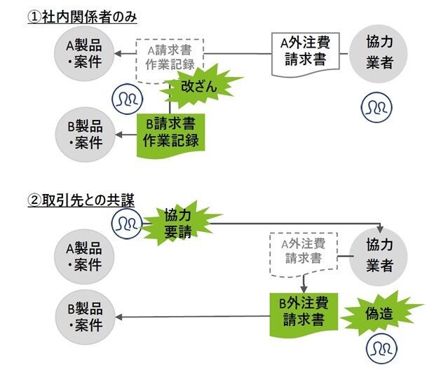社外の取引先との共謀がない場合、取引偽装は主に工数など労務費において行われることが多いが、取引先より受領した請求書などの取引証憑を社内で改ざんした不正事例もある(図表①)。