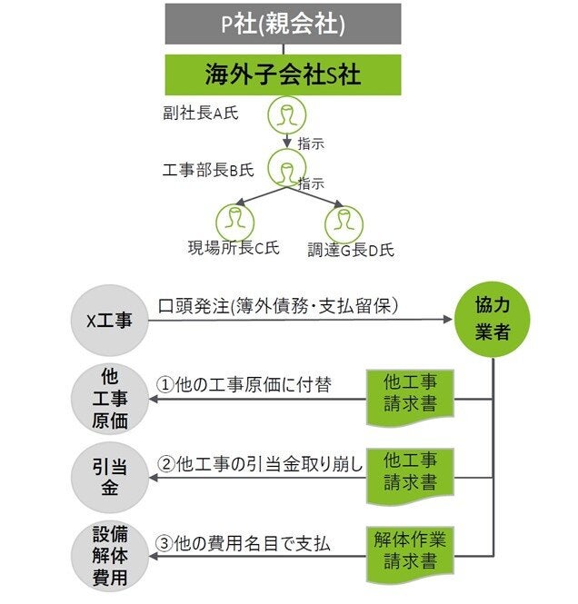 国内外の建設・不動産事業を営むP社の海外連結子会社S社において、2019/3期から2022/3期にかけて副社長A氏と従業員らが赤字工事の最終赤字を回避するため、協力業者と共謀して、本来赤字工事に計上すべき工事原価を将来受注予定であった別工事の原価として計上していた。