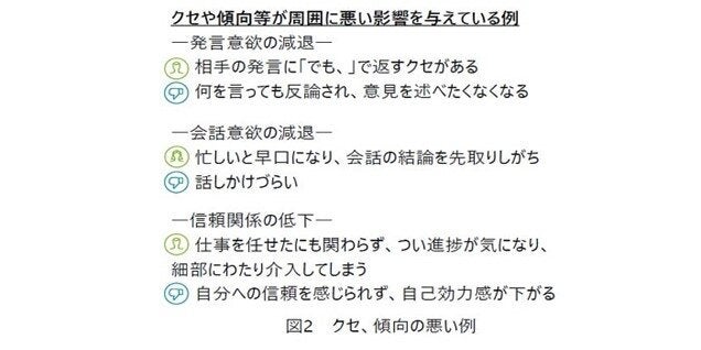 図2でクセ、傾向の悪い例を示す。いずれもよくある事例ではないだろうか。いずれの例も自分の何気ない行動に対し、周囲がコミュニケーション意欲や信頼感を失っていることが分かる。