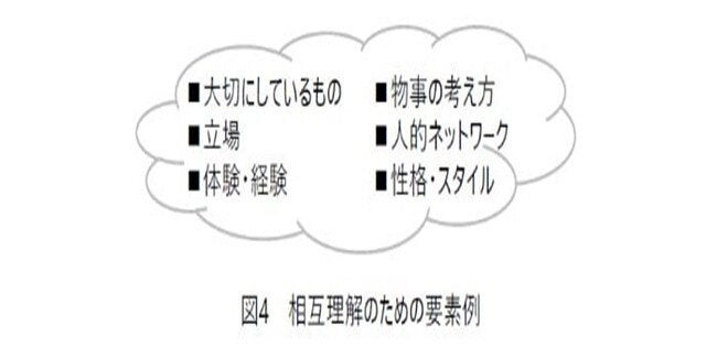 自己への働きかけの最後に「価値観・考えの発信」を述べたい。「価値観・考えの発信」は自己への働きかけと他者への働きかけの結節点ともなるべきものだ。自己理解を深めた価値観・考えの発信は、相互理解の土壌として必要となるからだ。相互理解にはお互いの存在そのものを認め合い、相互に尊敬・信頼し合える状態を作り出すことが前提となる。その前提には、例えば図4に挙げるような要素の理解が含まれる。