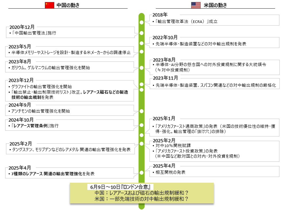 6月9~10日の英国ロンドンでの米中通商協議では、中国側のレアアース輸出管理の緩和と引き換えに、米国側がジェットエンジンなどの航空機部品や半導体などの輸出管理を緩和することに合意したという(※11)。中国の「レアアース輸出管理」カードによって、米中の関税戦争は事実上の休戦となった(※12)。ただし、一部ではレアアースの輸出が再開されているものの、防衛関連向けの輸出はまだ再開に至っていない。