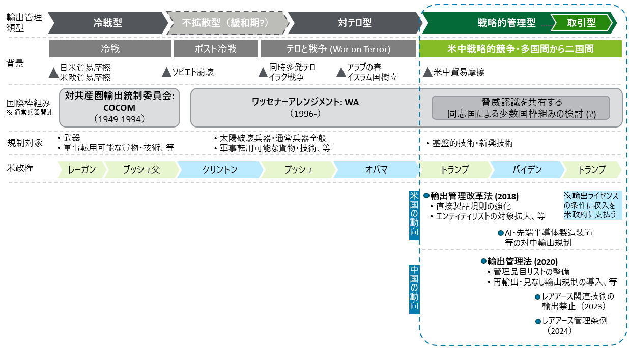 これまで見てきた措置は中国のみが採用する手段かと言うと、実際はそうではない。国家は古くから、輸出管理を戦略的目標の達成手段として用いてきた。なかでも米国は早期からこの制度を導入し、包括的に運用してきた。中国による最近の輸出管理制度の整備は、米国の制度を模倣しているともいえる(※図3参照)。第1次トランプ政権以降の米国の輸出管理の展開を振り返りたい。