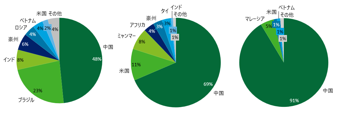 図2 世界のレアアースの埋蔵量(左)、鉱石の生産量(中央)、精製量(右)における中国のシェア