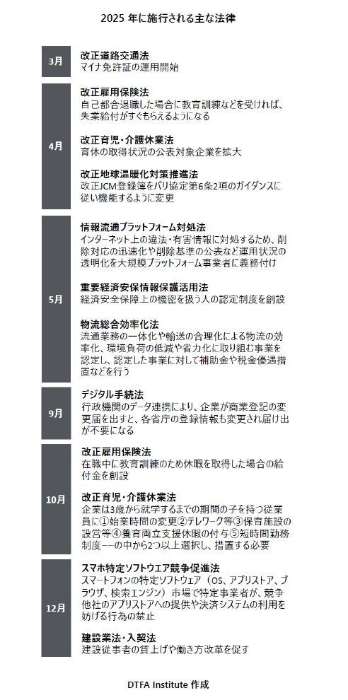2025年は雇用やデジタル、経済安全保障などの領域で制度が変わる 。企業や働き手に影響を及ぼすと思われる主な法律をDTFAインスティテュートがピックアップし、施行時期や内容を整理した。