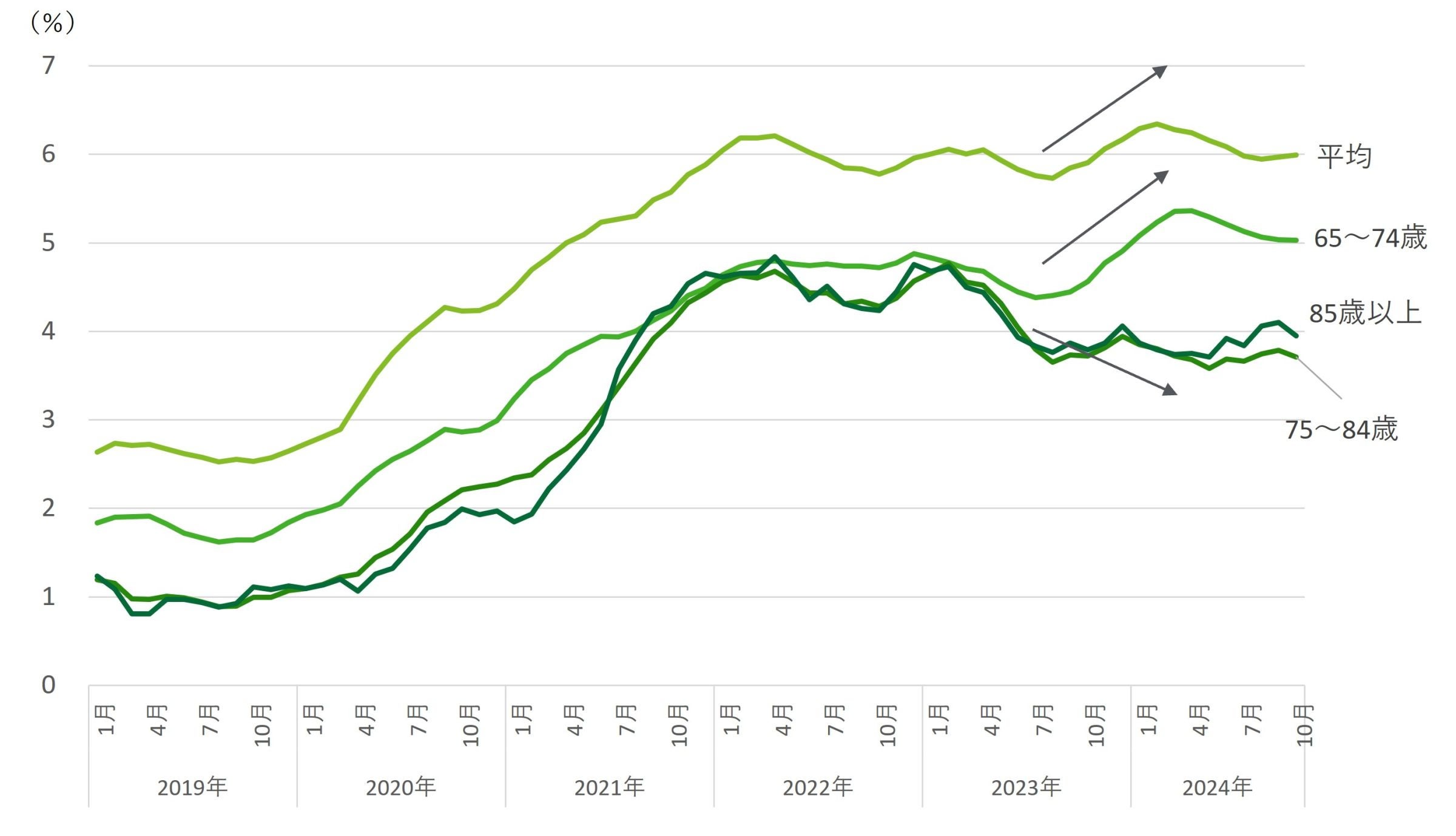 65歳以上が39%程度を占める。特に70歳以上の寄与度が高まっている