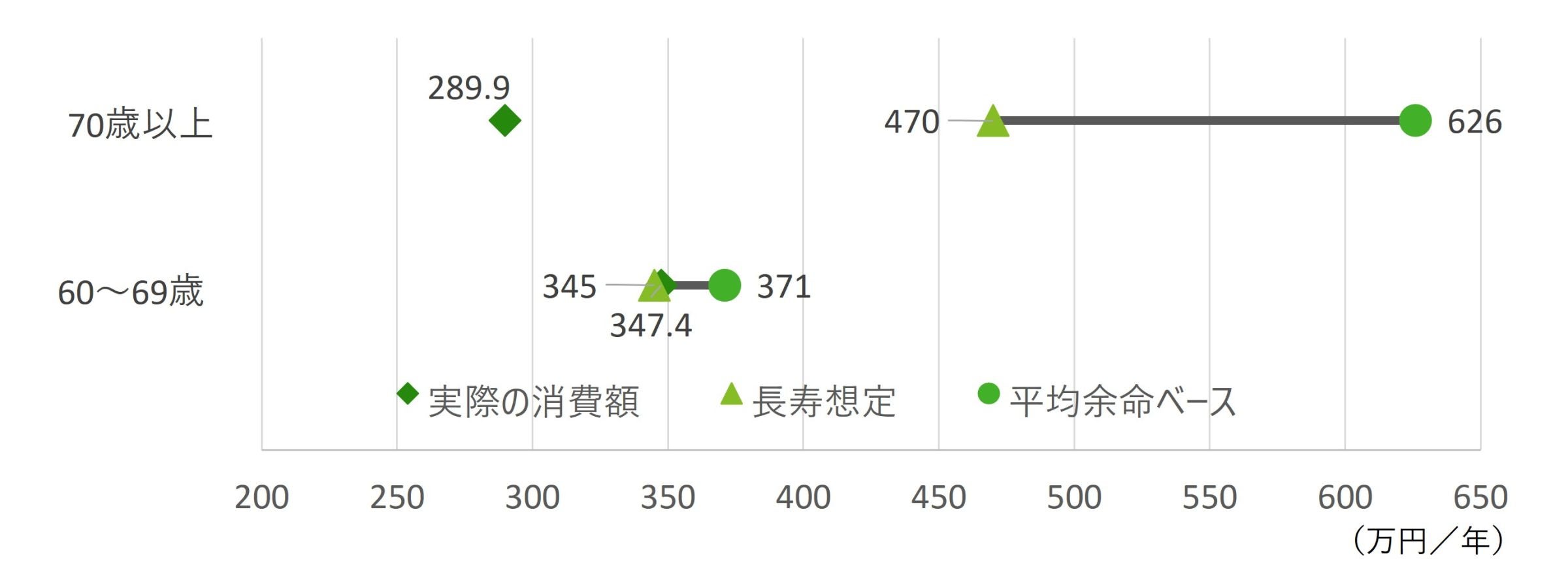 【図表2】 平均的および長寿想定での合理的消費額と実際の支出金額(万円/年)