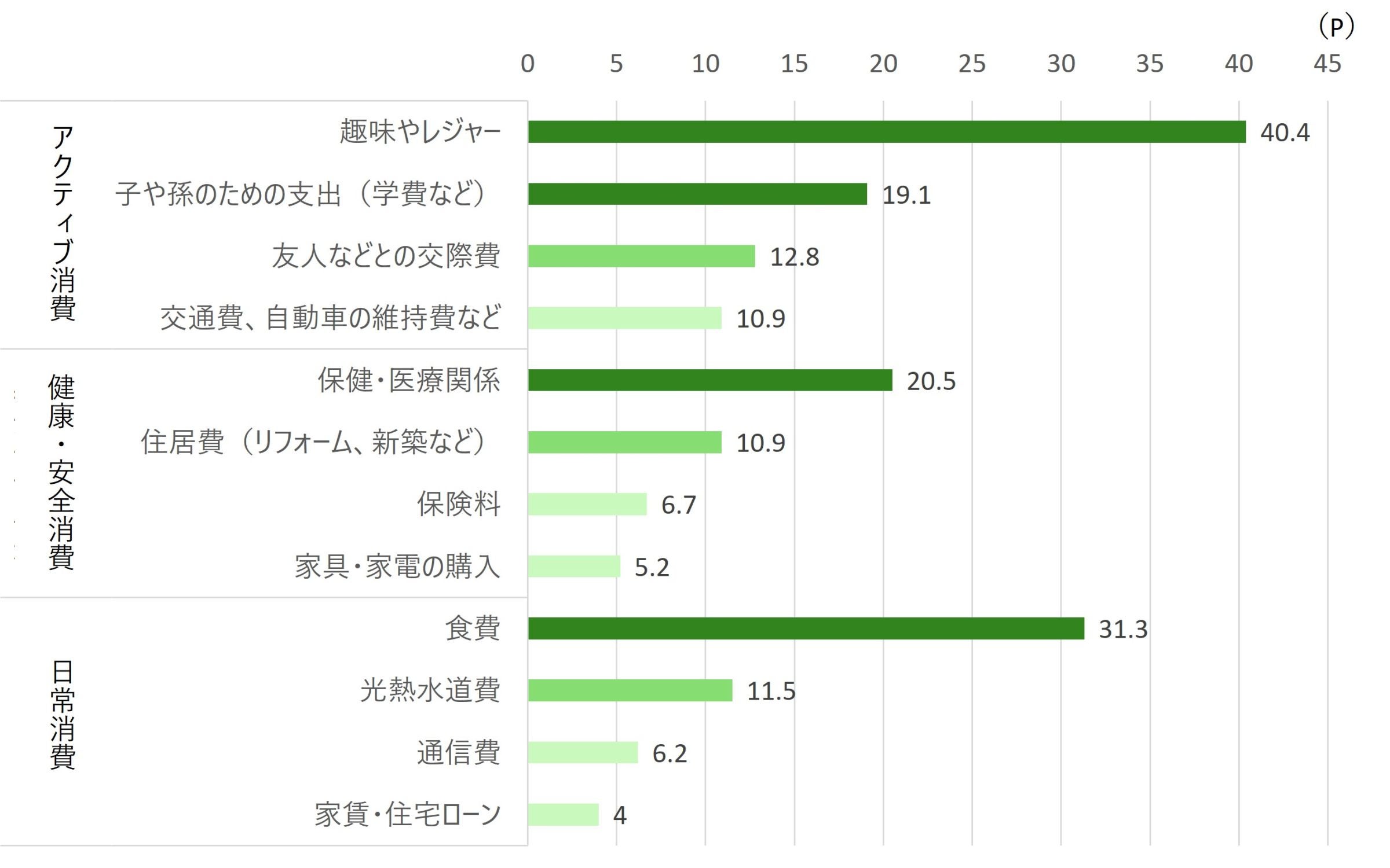 (注) 質問項目名は内閣府調査項目によるが、アクティブ消費、健康・安全消費、日常消費の分類はDTFAインスティテュートによる