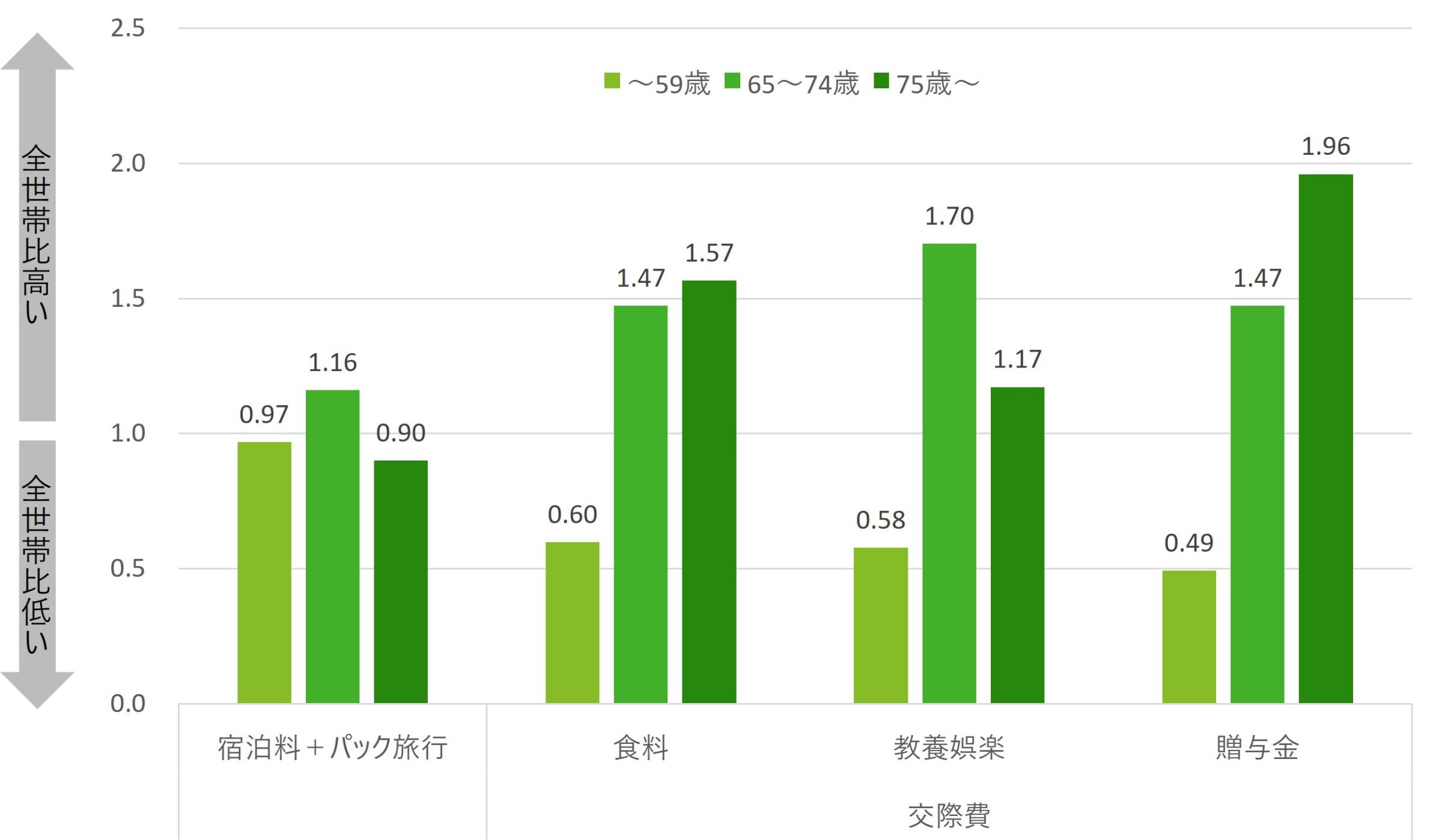 また、宿泊料+パック旅行は65~74歳の前期高齢者では高く、体力低下に伴って後期高齢者では低下する。しかし、段階を細かく見ると、85歳以上では大きく低下するが、75~79歳で1.11、80~84歳でも1.08と、強い支出意向が長期間にわたって続くことが特徴である。