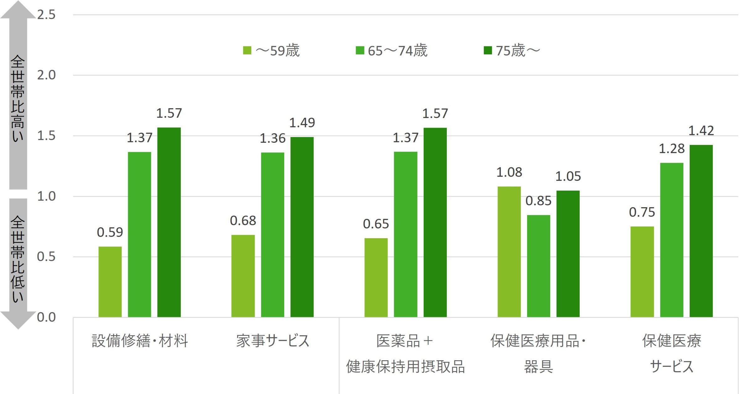 高齢者世帯では、保健医療費および住居費の中では設備修繕費、家具・家事用品の中では家事サービスが高いことが特徴である。「家・暮らしの安心安全」および、「ヘルスケア・セルフメディケーション」の必要性が、年代を問わず高齢者にとっては高いからである。