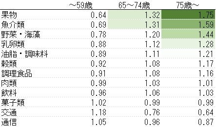 生鮮食品の中で、果物の特化係数は1.32から1.75、魚介類は1.31から1.59、野菜・海藻も1.20から1.44と、前期高齢者から後期高齢者に向かうにつれて高まる傾向にある。生鮮肉および加工肉については、85歳以降になると激減するが、75歳~84歳は1.04から1.10と、大きな落ち込みはない。また、調理食品については65~74歳は1.08だが75歳以降は1.16に上昇する。これは加齢に伴って家事労力の削減ニーズが高まっていると見られ、注目できよう。