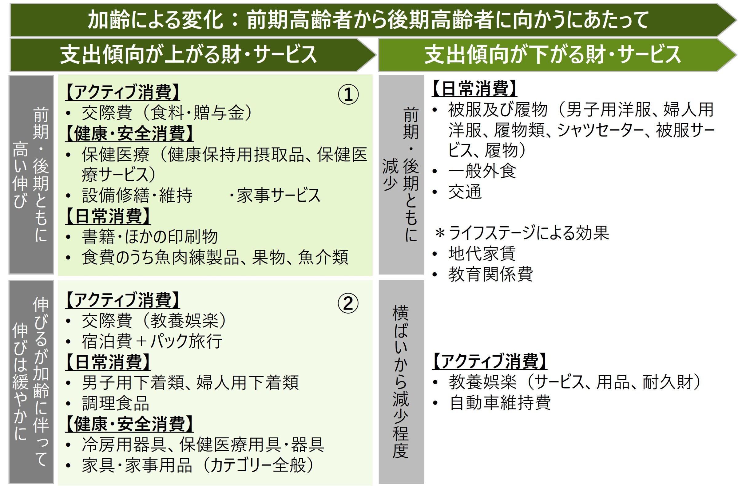 (注1) 支出傾向が高まるものは、65~74歳の特化係数が1.0以上で、59歳までと比較して65歳~74歳および75歳以上それぞれで、どの程度伸びているかによって品目別に順位付けした。支出傾向が下がるものは、65~74歳の特化係数が1.0未満での減少トレンドを順位付けしたもの