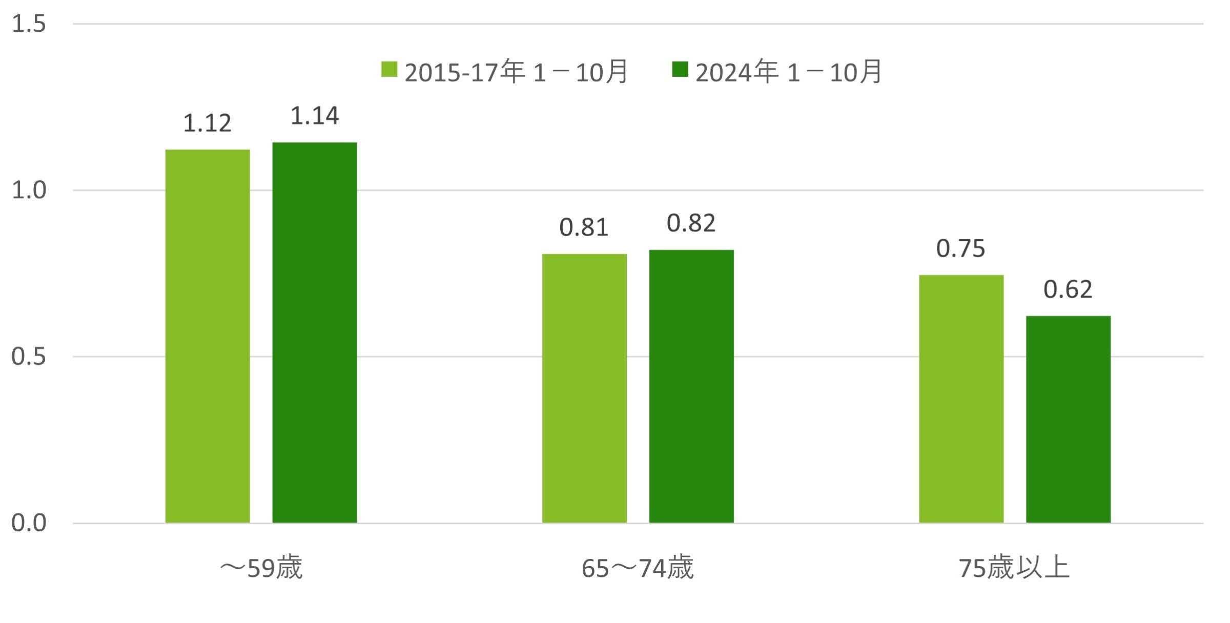 次に、高齢者の活動再開が遅れているのではないか。2023年段階の交通費は70代以降では、2015~17年平均と2021~23年平均の特化係数を比較すると、0.1ポイント減となっている[5]。直近の2024年1~10月2015~17年平均の同時期と比較しても、後期高齢者の移動費の特化係数はコロナ前に戻っていない(図表9)。これには徒歩などコストのかからない移動は入らない。さらに、WHILL株式会社が2023年1月発表した調査結果[6]によると、高齢者の半数がコロナ前よりも外出頻度を減らし、友人や近所との交流や外出意欲も半減させている。