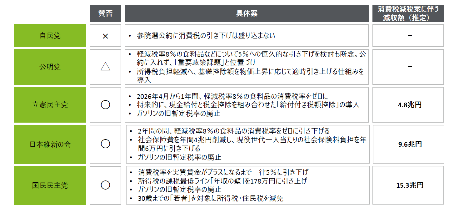 自民党は消費税の引き下げに反対し、参院選の公約にも盛り込まず、財政健全化や社会保障制度の持続可能性を優先する姿勢を示している。一方、公明党は軽減税率8%の食料品の税率を5%に引き下げる恒久的な政策を一時検討したが、財政規律を重んじる自民執行部と足並みをそろえるため公約から外した。最大野党の立憲民主党は2026年度に限り、食料品の税率をゼロにすると公約でうたった。日本維新の会も同様に、2年間限定で軽減税率をゼロにする方針を示している。軽減税率1%あたりの税収は6000億円と言われているため、機械的な試算として、食料品の税率をゼロに引き下げると年間の減収額は約4.8兆円と推定される。