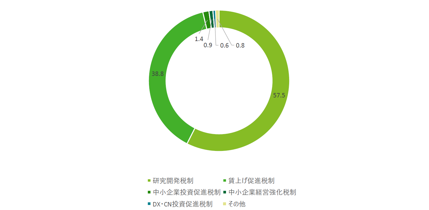 租税特別措置は、特定の政策目的を達成するために法人税や所得税などに対する優遇を設ける制度であり、毎年の税制改正で見直しが行われている。法人税関連の租税特別措置による減収額は、近年増加傾向にある(図表2)。特に、減収額の割合(減収率)が2022年度には13%を超えており、税収全体に占める影響が拡大している。そのうち、税額控除(1.3兆円)の内訳をみると、「研究開発税制」が約57.5%、「賃上げ促進税制」が約38.8%を占めている(図表3)。これらの税制は、企業の研究開発投資や賃上げを促進することを目的としているが、野党からは「大企業優遇」との批判が根強く、公平性が議論の対象となってきた。