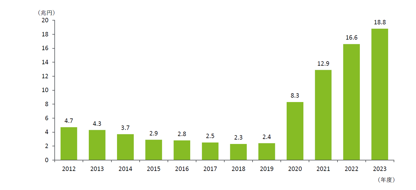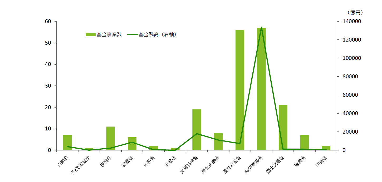 次に政府基金であるが、特定政策の実現のため、通常の予算と異なり複数年度にわたって支出できる点に特徴をもつ。単年度主義の通常の予算とは異なる仕組みであるため、基金を活用する企業の政策予見可能性を高めるメリットがある。しかし、2023年度末時点で基金の残高は約18.8兆円に達しており、2012年度の約4.7兆円から大幅に増加している(図表4)。コロナ禍や物価高対策、その他の特定政策に対応するための基金拡充が要因だ。また、残高は府省庁間で偏りが見られ、特に経済産業省が突出していることがわかる(図表5)。