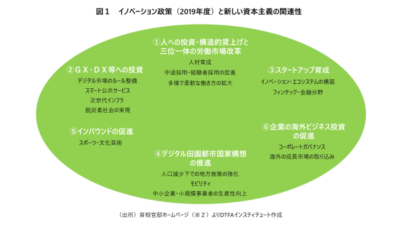 今回抽出したイノベーションに関する39項目は15の政策領域に区分できる。それらを岸田政権の経済政策「新しい資本主義」のテーマと関連付けたものが下記の図1だ。図中の黒字が2019年度のイノベーションに関する政策領域、白字が新しい資本主義のテーマとなる。