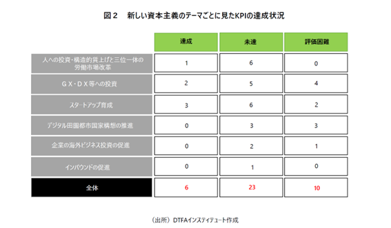 さらに新しい資本主義のテーマごとに個別施策のKPIの達成状況を確認すると、達成数が一番多かったのは「スタートアップ育成」に関連したもので3項目だった。「人への投資・構造的賃上げと三位一体の労働市場改革」は1項目にとどまり、未達が6項目と全体的に進捗が芳しくなかった。「GX・DX等への投資」も達成は2項目、未達は5項目にのぼった。「デジタル田園都市国家構想の推進」、「企業の海外ビジネス投資の促進」、「インバウンドの促進」においては、KPIの達成項目が一つもなかった(図2)。