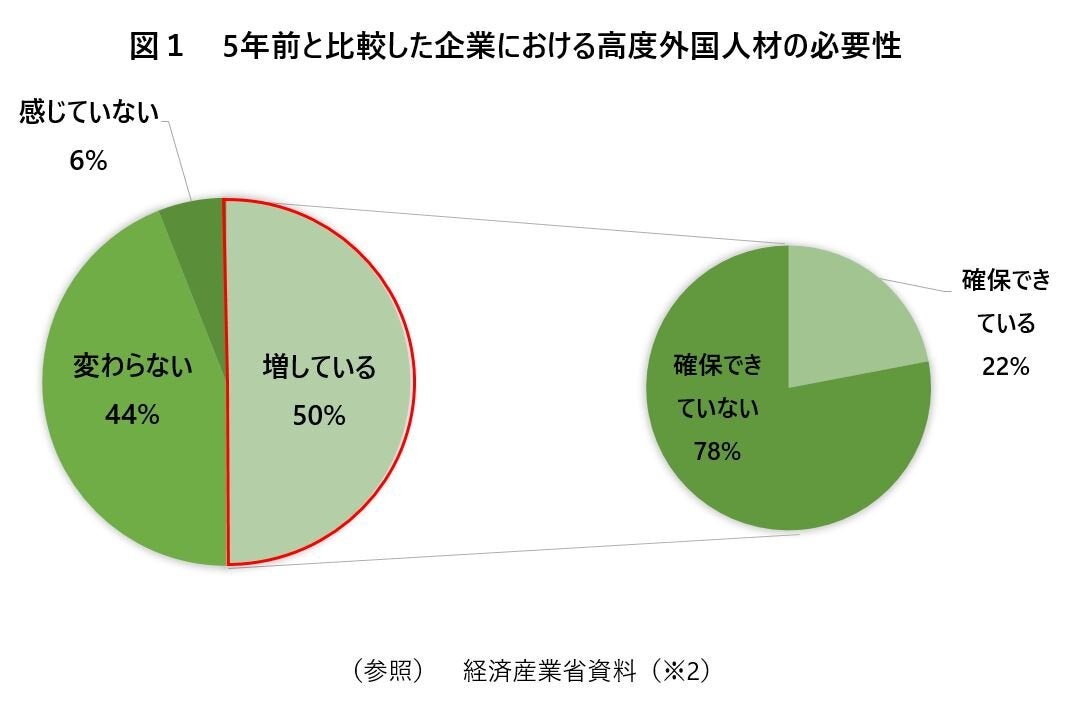 まず、高度外国人材の活用をめぐる日本企業の現状を見ていきたい。海外の高度人材を増やす必要性について、5 年前と比較して半数の日本企業が「必要性は増している」と回答したが、そのうちの78%の企業が高度外国人材を確保できていないという現状が明らかになっている※2(図1)。