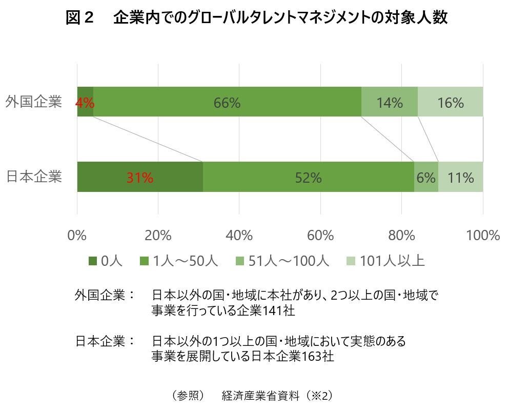 従来の日本的人材管理に対し、業務経験や保有している資格やスキルなどの情報を一元管理して、人材配置や育成計画などを戦略的に進める手法としてグローバルタレントマネジメントがある。調査では、グローバルタレントマネジメントを管理職以上の人材に対してどれぐらいの規模で行っているかについて、日本企業(回答数:163社)と外国企業(回答数:141社)にそれぞれに尋ねている。日本企業でグローバルタレントマネジメントを行っていないと回答した割合は 31%にのぼったのに対し、外国企業ではわずか 4%という結果であった(図2)。