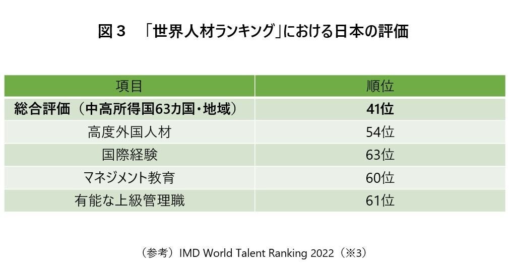 スイスの国際経営開発研究所(IMD)が2022年に公表した「世界人材ランキング」では、日本は対象となった中高所得国63カ国・地域のうち41位だった※3(図3)。2014年の調査開始以来、最低の順位となった。アジア・太平洋地域(14カ国)の上位はシンガポール、香港、オーストラリアが占め日本は台湾や韓国、中国に次いで9位となった。