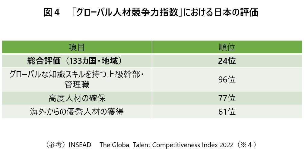 次に、フランスの欧州経営大学院(INSEAD)が133の国・地域を対象に調査した「グローバル人材競争力指数」(2022年)で日本は24位で、アジア・太平洋地域ではシンガポール、オーストラリア、ニュージーランドに次ぐ順位となった※4(図4)。個別の評価項目では、「グローバルな知識スキルを持つ上級幹部・管理職」―96位、「高度人材の確保」―77位、「海外からの優秀人材の獲得」―61位という結果になった。日本への寸評では、「依然として国の魅力度が弱点となっており、外国人材に対して開放性を高める余地がある」とも指摘された。