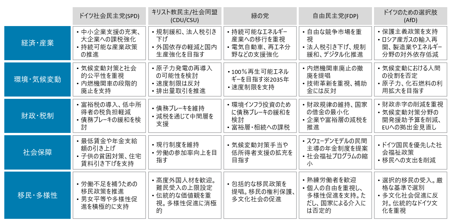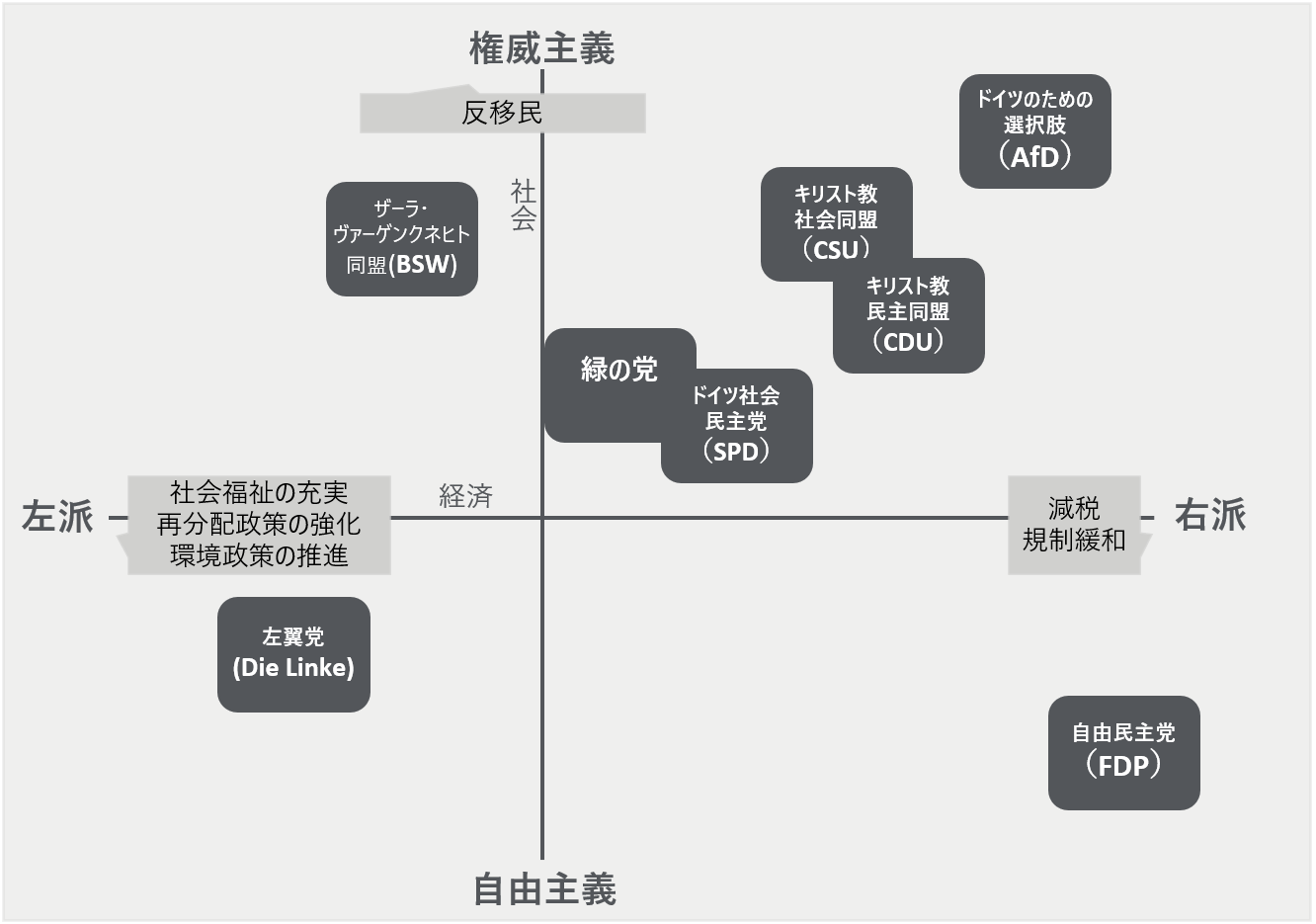 2021年に発足したショルツ政権は、中道左派の社会民主党(SPD)を主軸に、新自由主義的な立場を取る自由民主党(FDP)、環境政策を重視する緑の党による3党連立政権であった。ドイツの緑の党は、もともと環境政党として誕生したが、シュレーダー政権(1998~2005年)で連立に加わって以来、環境政策にとどまらず包括的な国家ビジョンを掲げるようになった。他国の姉妹党と比べて保守的な側面を持つ点も特徴の1つである。