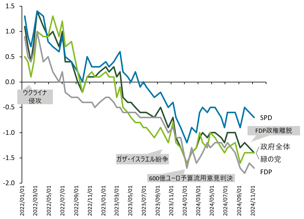 この3党連立政権は、政治的スタンスの異なる政党同士が手を組んだ「同床異夢」の体制だったため、政権運営の過程で内部対立が次第に顕在化していった(※図1参照)。2023年11月、連邦憲法裁判所が、新型コロナウイルス対策のために確保していた600億ユーロの予算を気候変動対策に転用する政府方針に対し、違憲判決を下したことで、政府は深刻な財源不足に直面。これを契機に、予算編成をめぐる連立内の対立が激しさを増していく。特に、クリスティアン・リントナー財務大臣を擁する財政の健全性を重視するFDPと、気候変動対策や社会福祉を重視するSPDや緑の党の間で溝が深まり、政権の安定性が大きく損なわれていった(図2参照)。