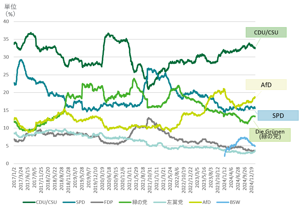 最後に、ドイツの連立シナリオと国際的な影響について検討する。最新の世論調査によると、首位を走るCDU/CSUが再び議会第1党に返り咲くことが予想される。しかし単独過半数議席の獲得は難しく、どの政党と連立を組むかが最大の焦点となる。