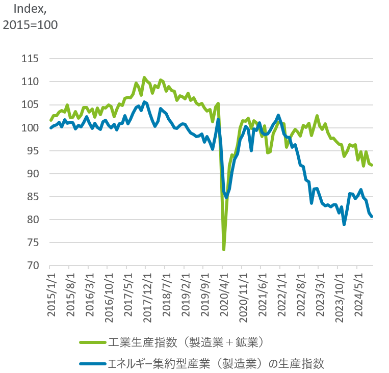 図6 ドイツの工業生産指数(製造業+鉱業)とエネルギー集約型産業の生産指数の推移