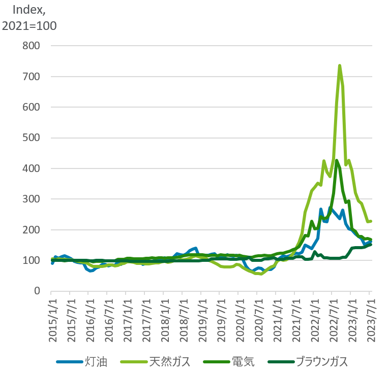 天然ガスの輸入拡大や省エネ政策により供給不足は回避しているものの、エネルギー価格は依然として高く、過去の平均的な水準を大きく上回っている(※図8参照)。こうしたコスト増は、企業の競争力低下につながっており、エネルギー集約型産業を中心に、海外移転を検討する動きが出始めている。これにより、産業の空洞化の懸念が、ドイツ経済のさらなる停滞を引き起こすリスクとなっている。