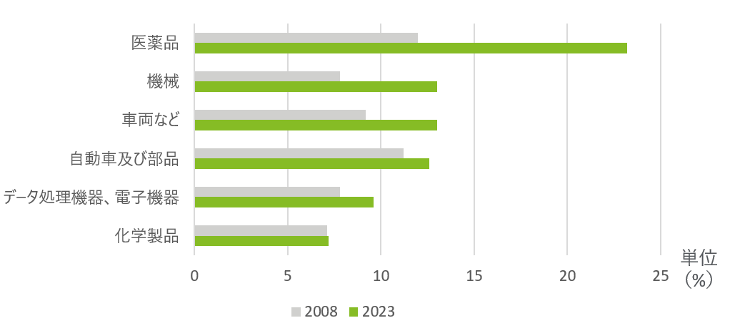図9 2008年と2023年におけるドイツから米国への輸出割合(産業別)