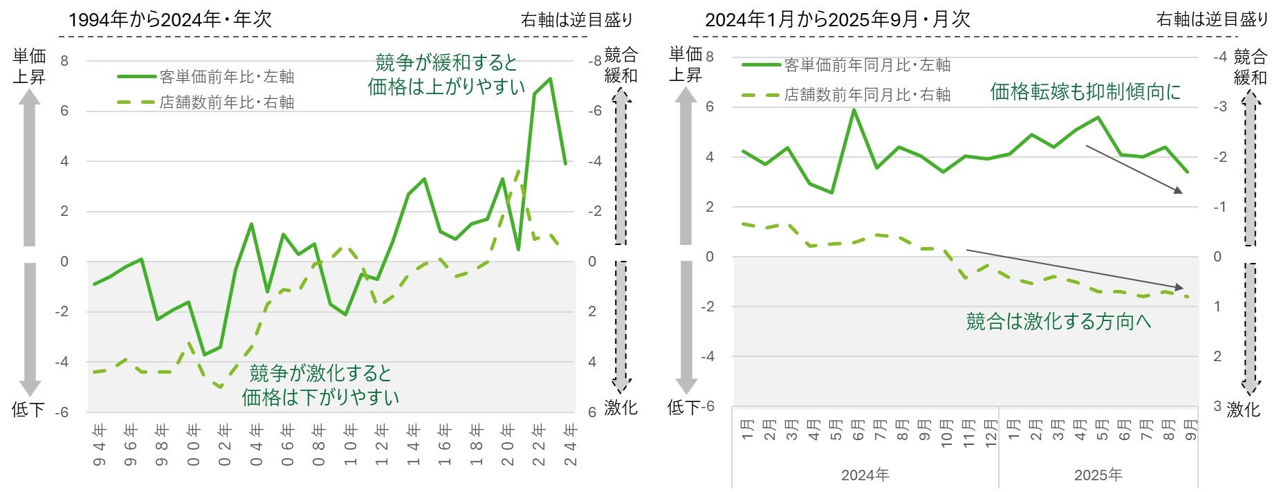 競争環境に目を転じると、価格抑制圧力がより強まる。図表6左で示したように通常、競争環境の激化と価格の感応度は高く、1年内に相関は収れんする。ただし、図表6右に見るように2025年には原価上昇を受けて、前年同期比で3%近い伸び率で推移している。これは事業者が原価上昇を客離れのリスクを覚悟しながら価格転嫁せざるを得ない状況が続いていることを示す。