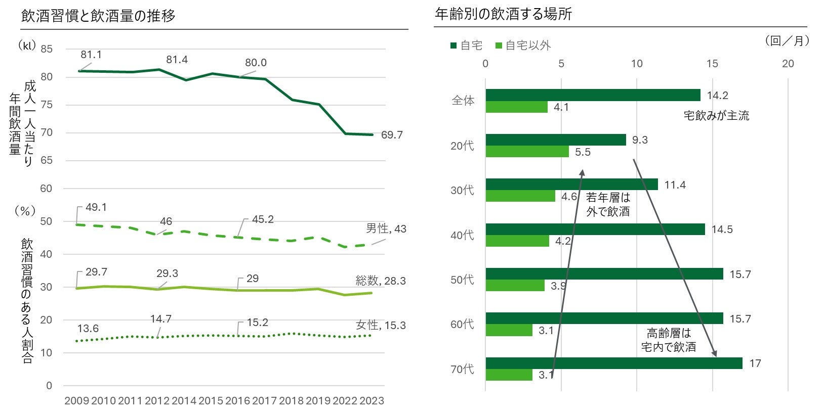 居酒屋業態は長期的には需要が停滞しているものの、飲酒ニーズ自体は底堅い。飲酒習慣のある人の数は図表7左に見るように、2009年以降では比較的安定推移している一方で、成人一人当たりの飲酒量は2015年以降減少傾向にある。