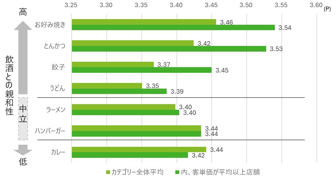 飲酒ニーズへの対応は、単価を向上させる効果が見込めよう。図表8では、比較的カジュアルなカテゴリー、価格帯で「食べログ 百名店」に選出された店舗のユーザー評価・平均分布を検討すると、いくつかのカテゴリーでは、単価の高い店舗ほど評価項目「酒・ドリンク」で好評価を得ていた。酒と相性の良いメニュー開発や酒の品ぞろえ強化が客単価に寄与する可能性があると考えられ、取り組む価値があるのではないか。図表8で検討したカテゴリーではカレーを除く多くのカテゴリーで飲酒ニーズとの親和性があるため、幅広い事業者にとって可能性が期待できる。