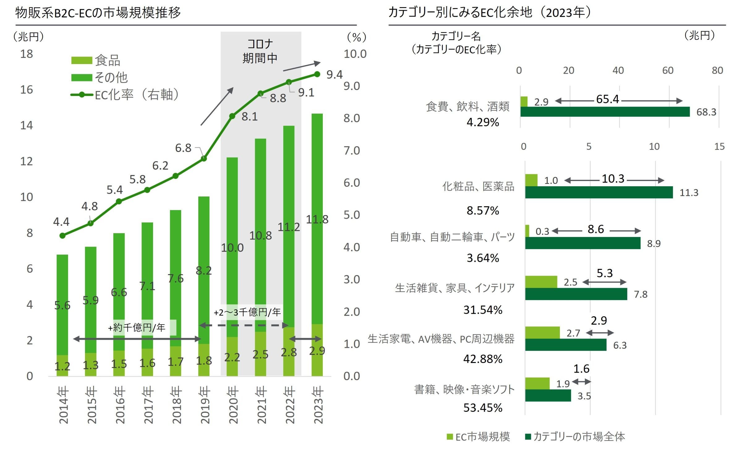 コロナ後に日本のEC化は伸び悩んでいる。図表1左で示すように、2023年の物販系B2CのEC市場規模は約14.6兆円で、EC化率は9.38%となっている。コロナ期の2020~2022年は外出抑制が追い風になって伸びた。しかし、その後はリアル回帰が進んでいる。