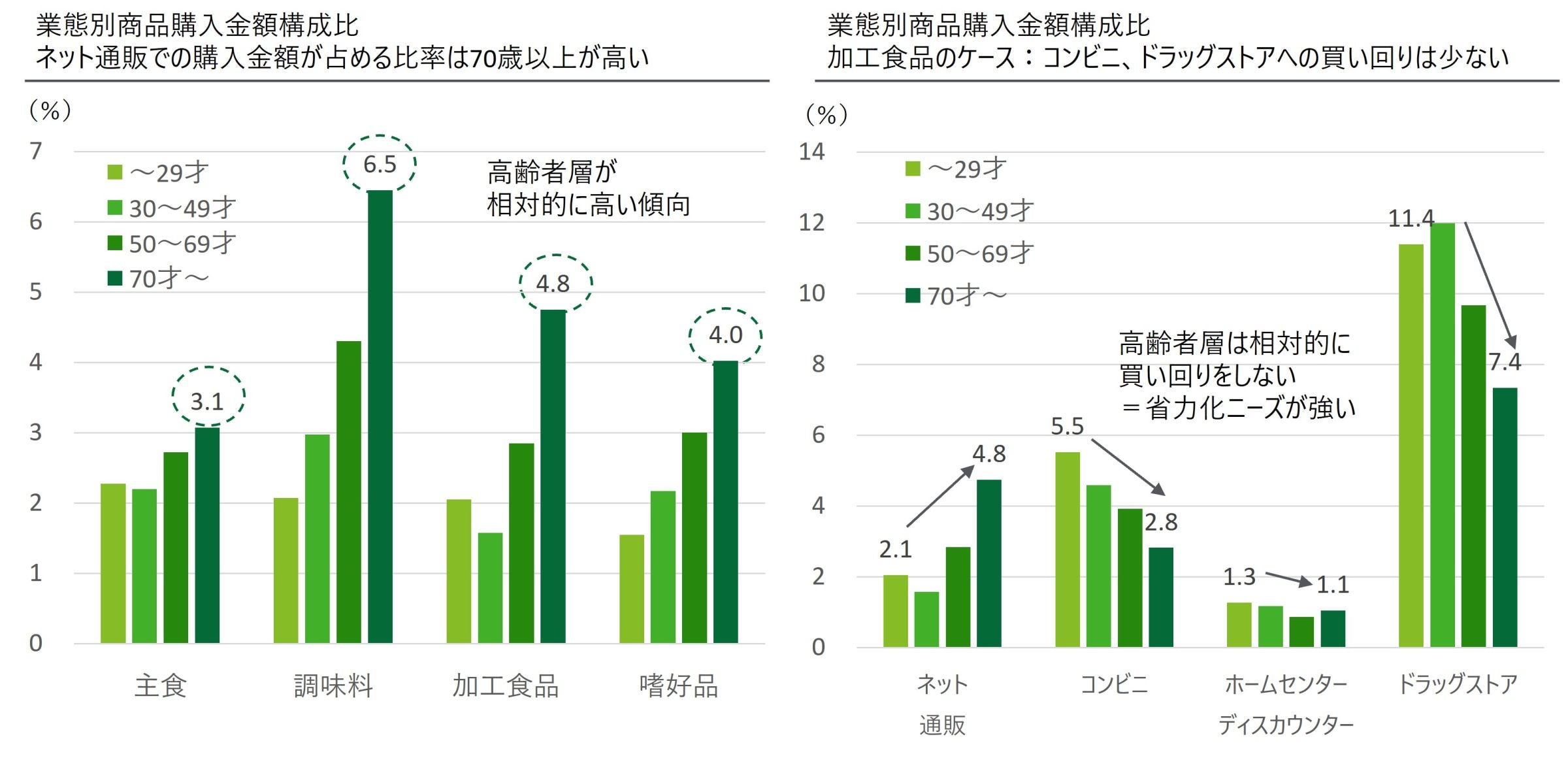 高齢者は身体的、体力的な制約から省力化ニーズが強く、リアル店舗での買い回りは難しい。図表4で示すように、食品の主な購買先であるスーパーを除いて、高齢者は他業態への買い回りが相対的に少ない。さらに、主食、調味料、加工食品、嗜好品のそれぞれの品目で、EC・ネット通販での購入金額の比率が高いのは70代以上となっている。