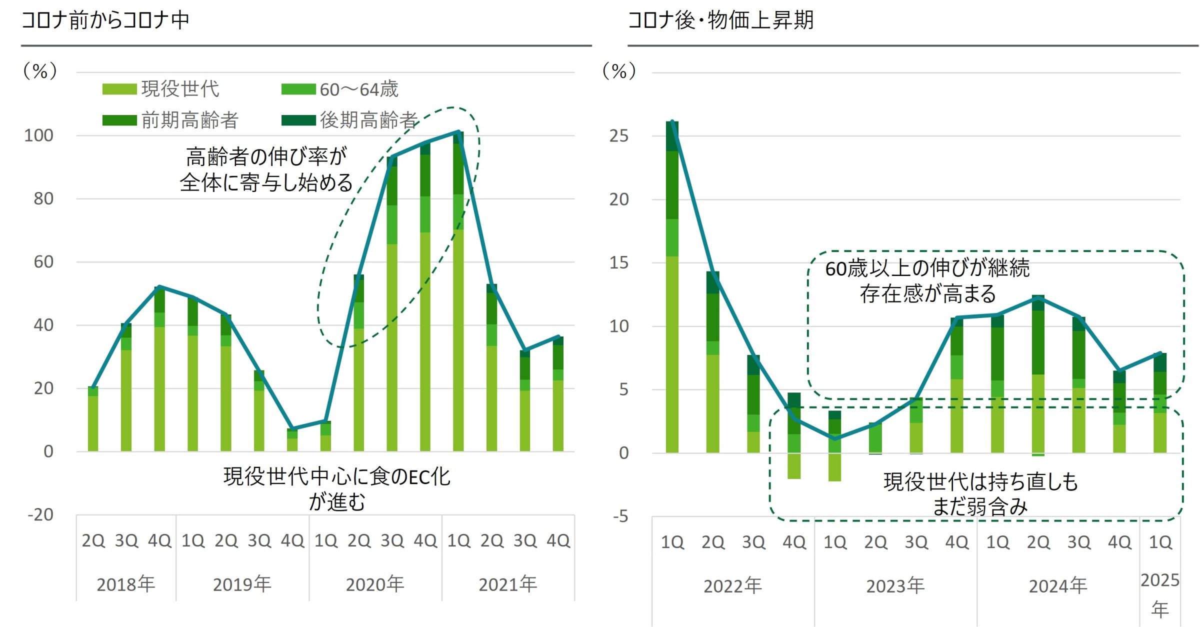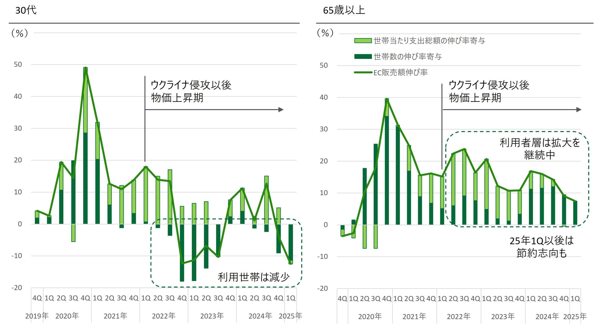 この変化の契機は物価上昇局面に入ったことだろう。図表6左に見るように、2022年2Q以降、現役世代のうち30代では世帯数伸び率がマイナスに寄与している。生活防衛志向が強まる中、リアル回帰も相まって、コスト負担を嫌ったEC離れが生じていると考えられる。一方、図表6右の65歳以上の高齢者については、世帯数と世帯当たり消費額の両面で伸びが継続している。この世代の購買の省力化ニーズは根強いためと思われるが、世帯当たり消費伸び率が縮小に転じていることから、生活防衛的な購買数量抑制や選別消費も存在している状況がうかがえる。