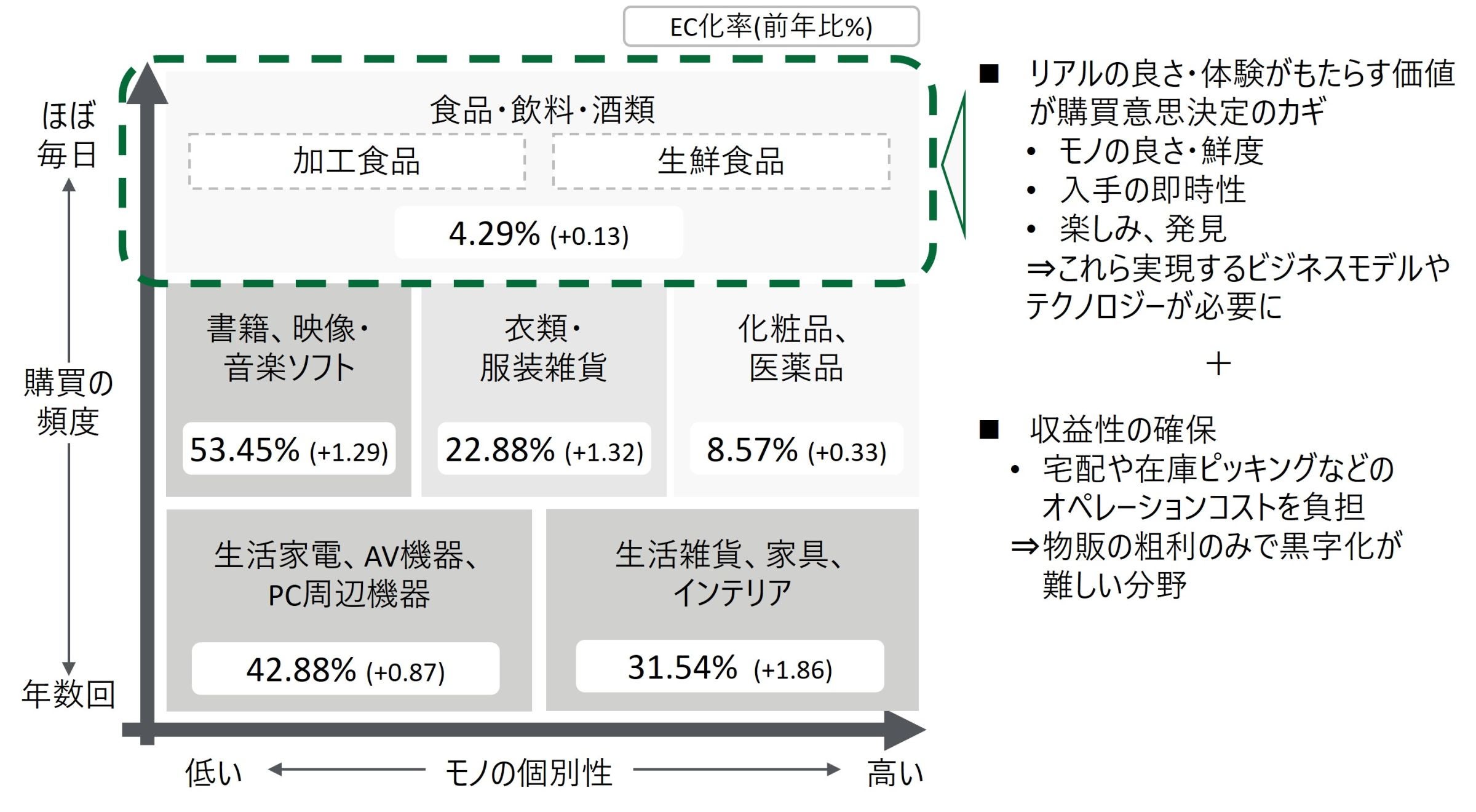 一方、食品ではこうはいかない。特に生鮮食品の場合は、同じ野菜でも一つ一つで鮮度などが違うため、見た目や五感でどれを買うか判断する必要がある。同時に購買頻度が高く、すぐに持って帰って使える購買の即時性が重要なポイントになる。加えて、多くの場合は日々の献立が未定のまま売り場に行くため、購買行動は探索的になりがちである。そのため、売り場では商品の魅力をうまくアピールするだけでなく、発見する楽しみも提供する必要がある。こうしたリアルな体験価値が重視される財であるため、EC化が遅れてきた。しかし、ビジネスモデルやテクノロジーを活用して、体験的な要素を代替するような付加価値を提供できれば、食品のEC化はまだまだ進めることができるだろう。