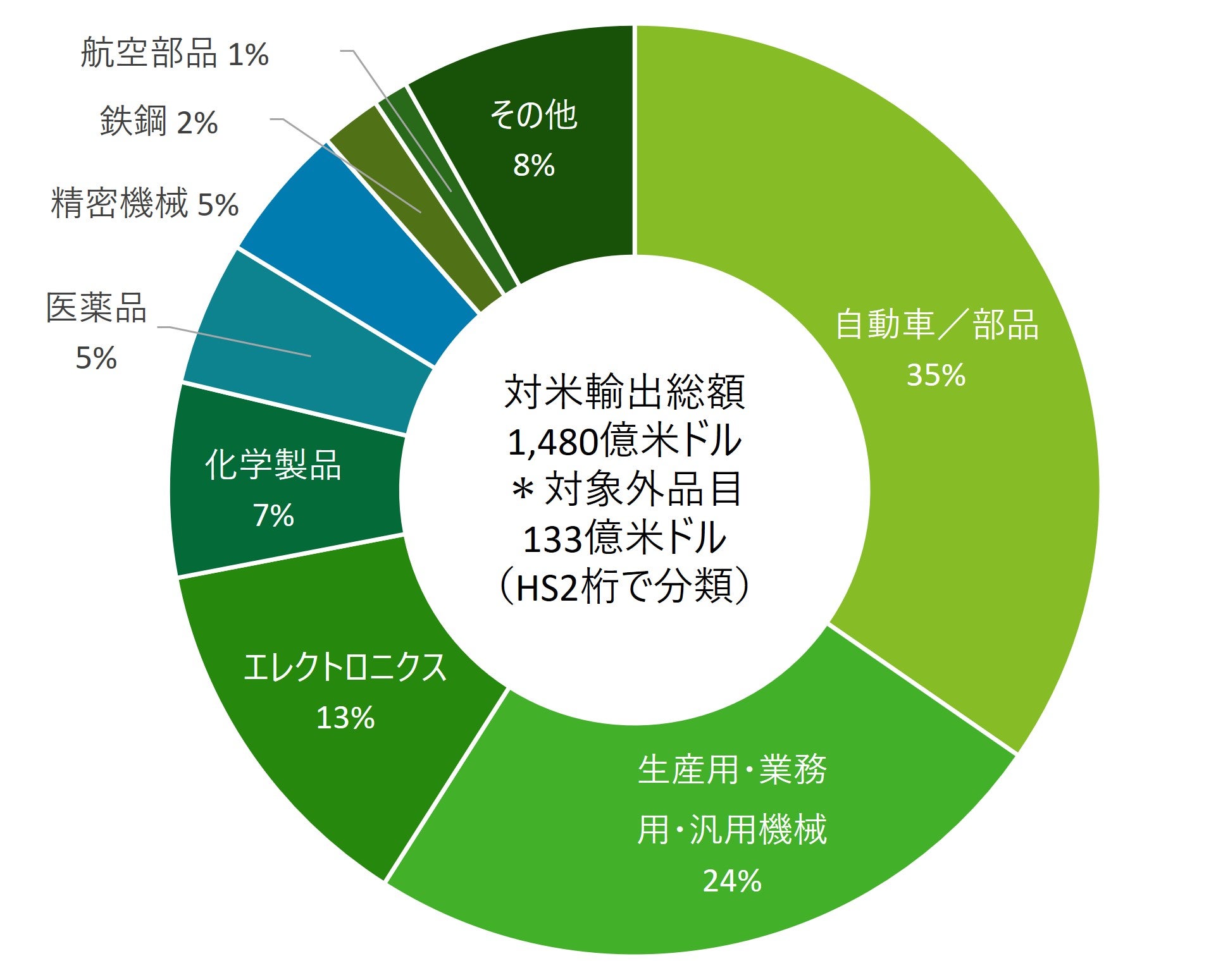 米国では2025年4月2日に大統領令が発せられ[2] 、同月5日から全ての国・地域の製品を対象に原則10%の相互関税(最低基準)が適用されている。それ以前から品目別に追加関税を実施する措置が発表されており、鉄鋼・アルミ等に25%(3/12以降)、自動車・自動車部品に25%(4/3以降)が賦課されていた 。