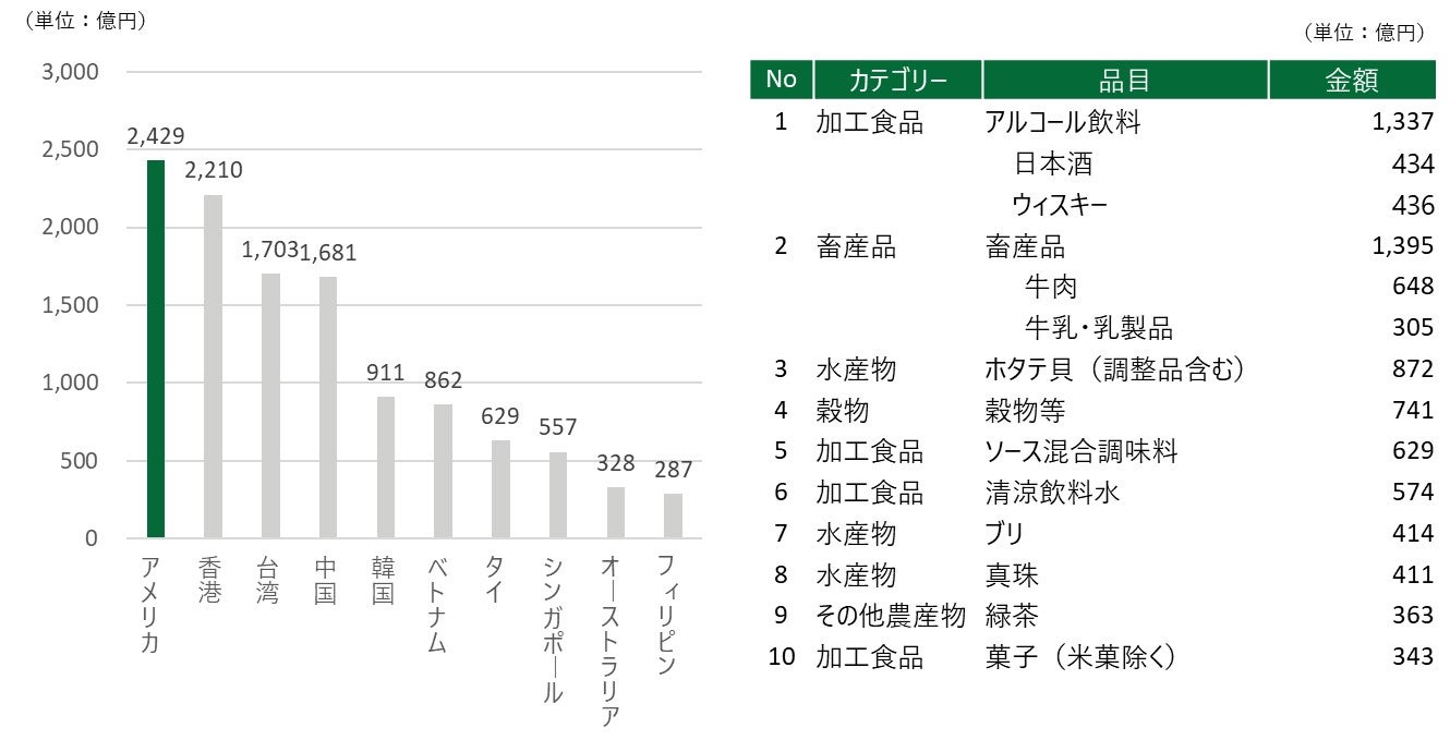 【図表4】 食品の輸出先上位10カ国と米国向け品目の上位10品目