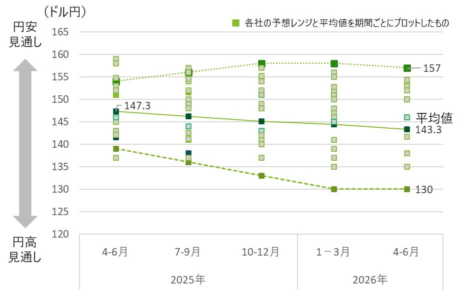 データソース:日本国内主要金融機関、シンクタンク8社(みずほ銀行、三菱UFJ銀行、三井住友銀行、ソニーフィナンシャル、野村證券、SMBC日興証券、みずほ証券、日本総研)による予想レンジおよび平均値を集計、プロットしたもの。3月末、および4月1日調査