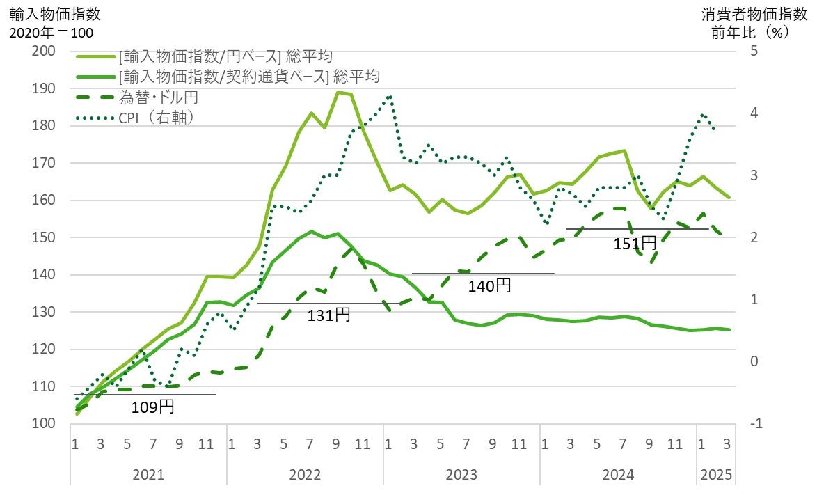 為替から単純にCPI水準を見出すことは困難だが、2023年末以降、両者の相関性は特に強まっており、店頭での商品価格下落は消費者マインドにプラスに働くと考えられる。小売事業者にとっても仕入れ原価上昇による収益環境の厳しさが、一定程度落ち着くと予想される。