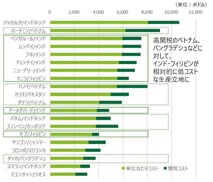 中国からの迂回輸出を防ぐ趣旨から、ベトナムにも46%の高い関税が課されているが、インドやフィリピンについては、それぞれ26%、17%と相対的に低めにとどまっている。図表9で見るように、現在はインド、フィリピン、ベトナムは製造立地としては単位当たりの製造コストで大きな差がみられない。しかし、関税を追加的なコストとして考慮すると、ホーチミン、ハノイといったベトナムでの製造コストが相対的に高くなり、インド、フィリピンの各都市は米国向けの輸出拠点としては、相対的にコスト優位性のある生産立地となりうる。
