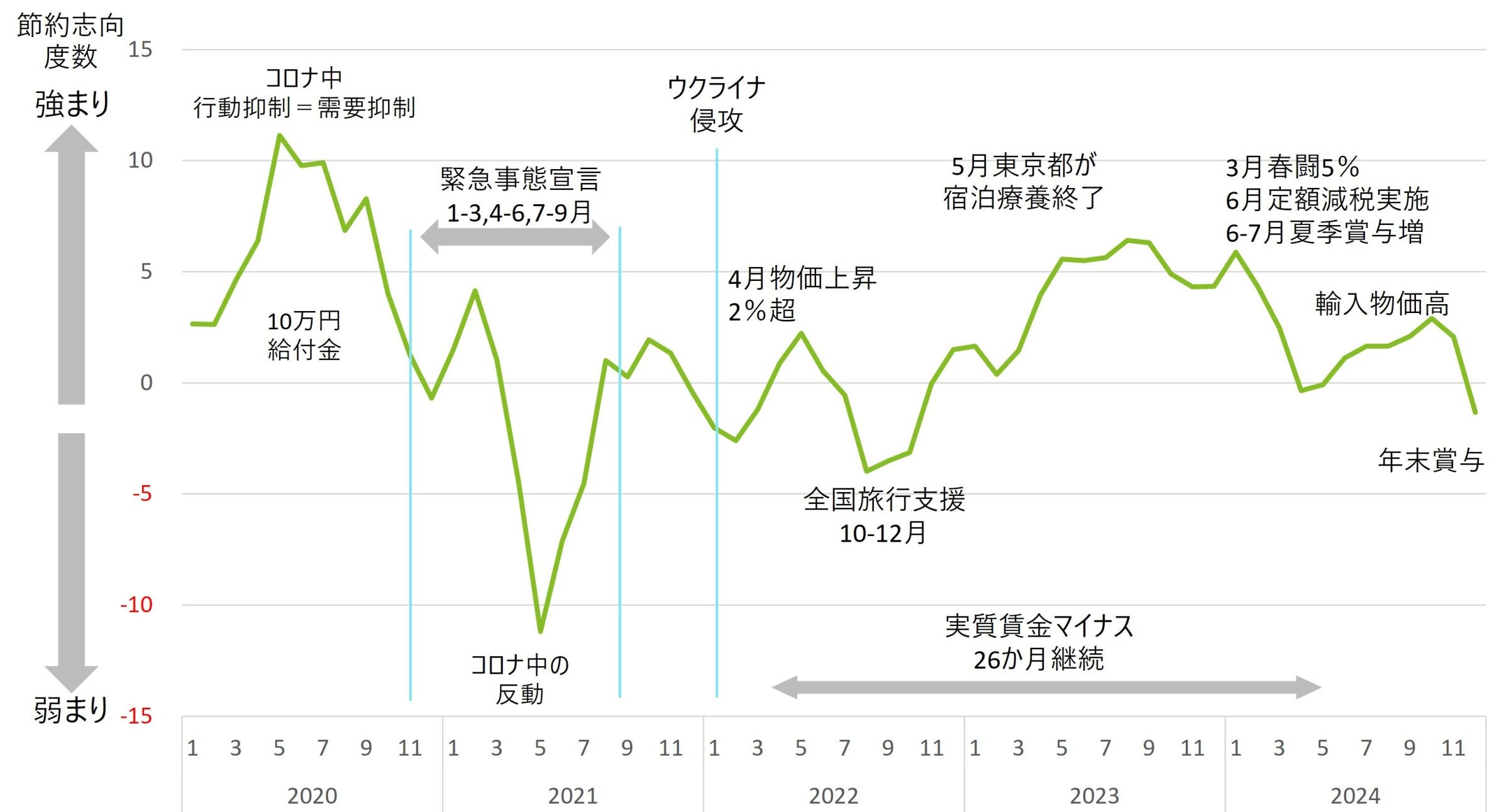 図表1に示すように、消費者の節約志向度数は賃金、物価および政策の動向に左右されてきた。