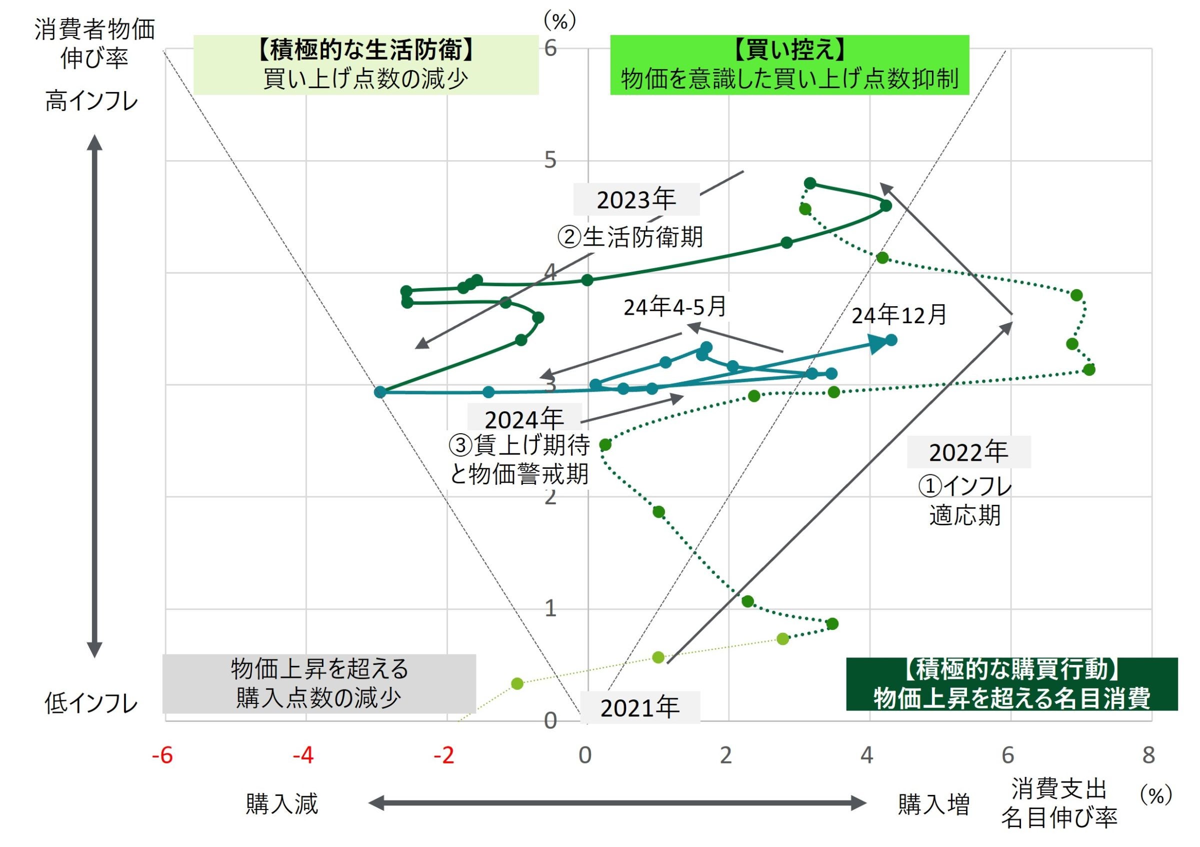 ただ、物価が一段と上昇しようとするタイミングで買い控えによる生活防衛的な傾向が起こりやすい点は、消費者行動を理解する上で重要ではないか。